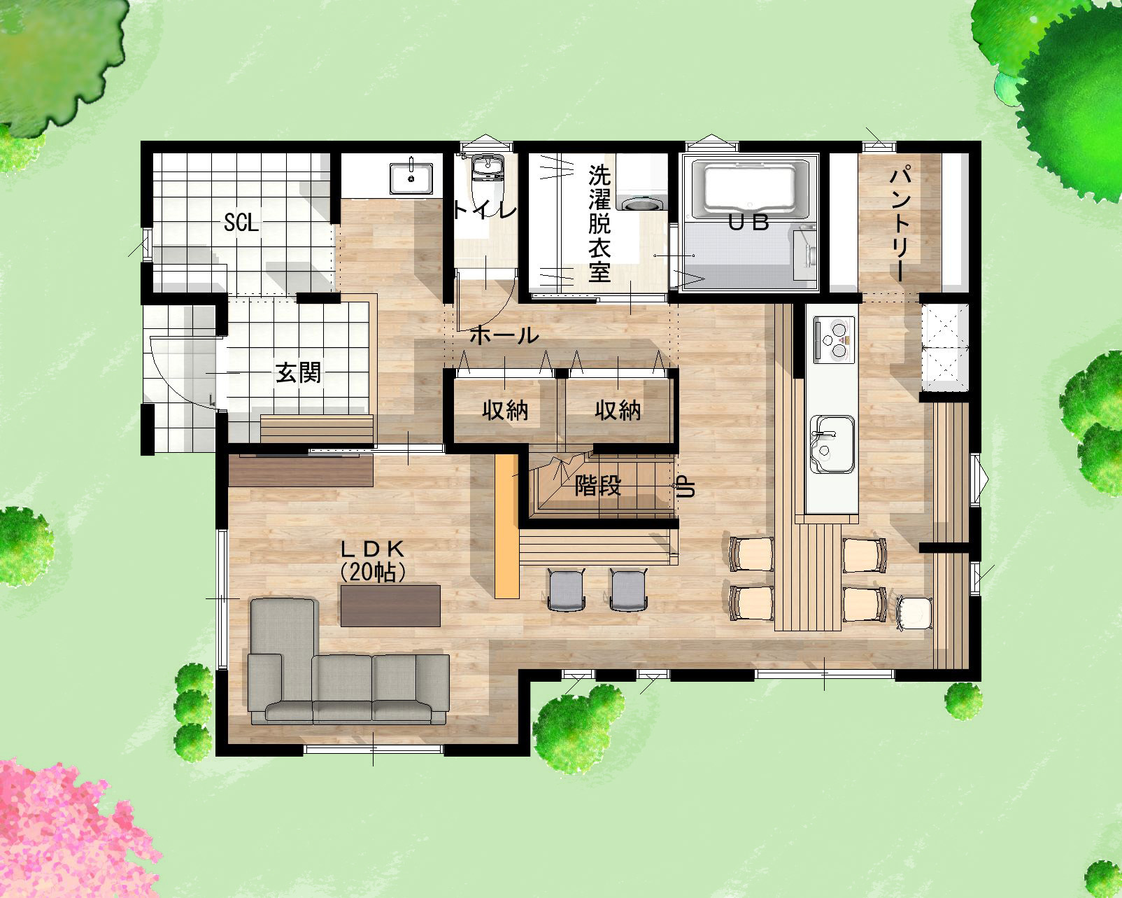 20帖の広々としたLDKと2階には南側一面に大きくバルコニーがついた3LDKのお家。